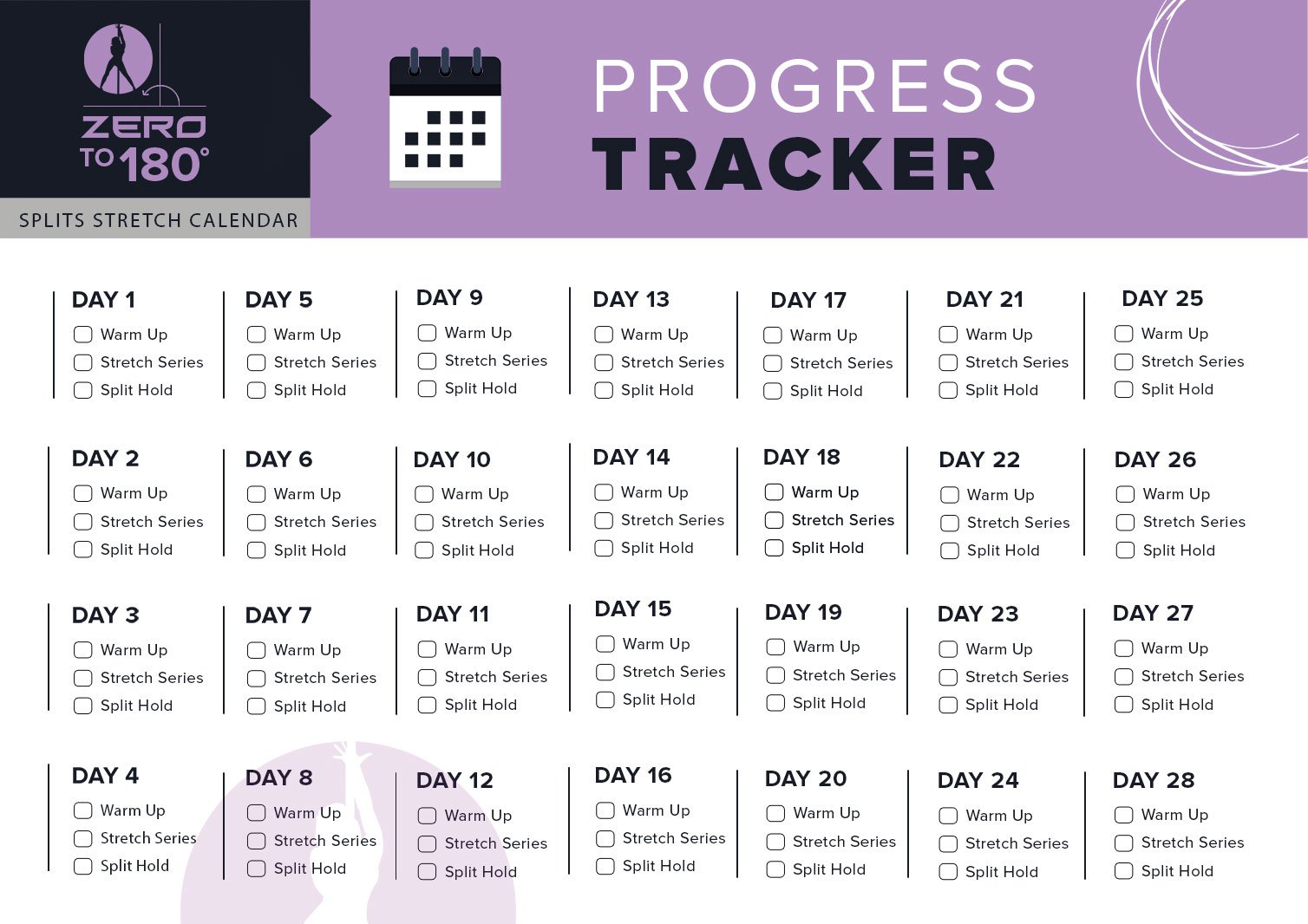 Also included in each of the books is a detailed progress tracker. Mark off each stretching session using our progress calendar and ensure you stay focused on the end goal: getting into those beautiful flat splits!